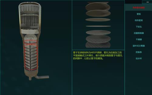 下图为主要设备蒸汽发生器的内部结构截图。学生通过鼠标操作观察主要设备(反应堆压力容器、主泵、蒸发器等)的内部结构。