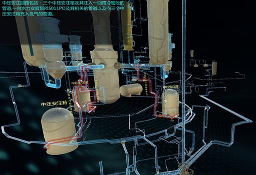 下图为RIS系统中压安注回路工作原理动画介绍截图。工作原理以三维动画方式展示,并有配音和文字说明,在播放工作原理的过程中,解说内容对应三维场景中的设备、管路等模型高亮醒目显示,有助于学生观看和理解工作原理内容。